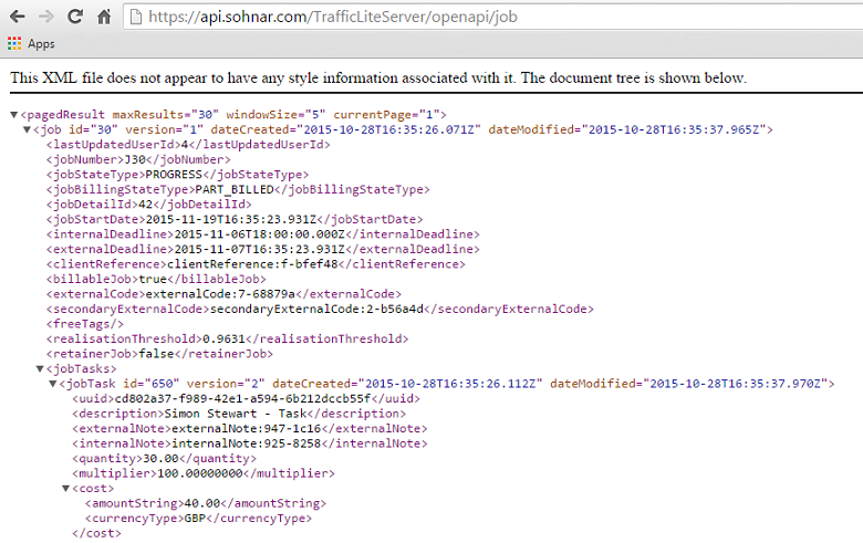 After typing your username and API token you will see the default content type XML response rendered to the browser window.