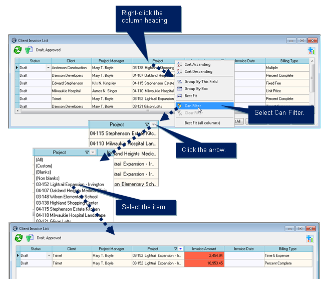 Limit, or filter, informationIn lists or tables, you may want to have fewer items so you can concentrate on exactly what you're looking for. For example, you want to see invoices for only the Lightrail project. Here's how you would do it: