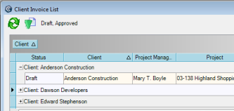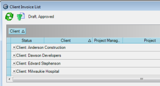 In this example, on the Client Invoice List window, after right-clicking the Client column and clicking Group by this field, the list is grouped by client: