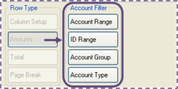 Note: You can specify more than one range, account group, or account type per row. If you do, however, all accounts in the ranges, groups, and types print together and produce one subtotal. To get separate subtotals, you must set up separate Amounts and Total rows for each range, group, or type.