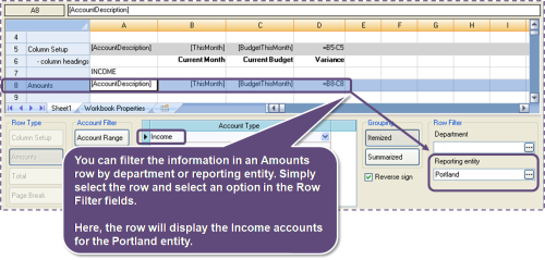 1. Make sure that the row heading (see next step) indicates the company (multi-company only), department, or reporting entity chosen.