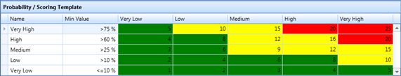 The risk register uses the information in this grid to score and color code the risk events.