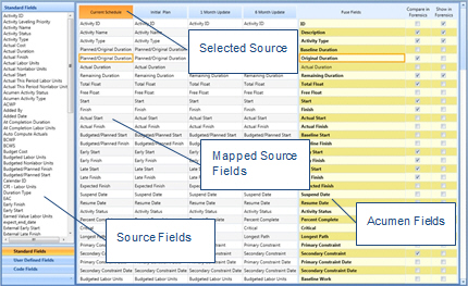 Field mapping is flexible in that an individual Acumen field can get its data from any source project field. Further, the mappings between source projects may be different. For example, Baseline Start may come from Start1 in Project A and BaselineStartDate in Project B (all within the same workbook).