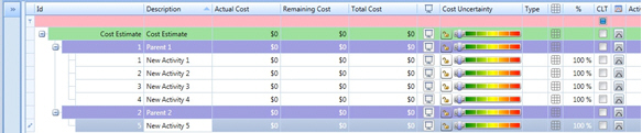 You can create any number of hierarchical levels or groups in the cost estimate. Any time an activity, or group of activities, is dragged onto another row, it becomes a child of that row.