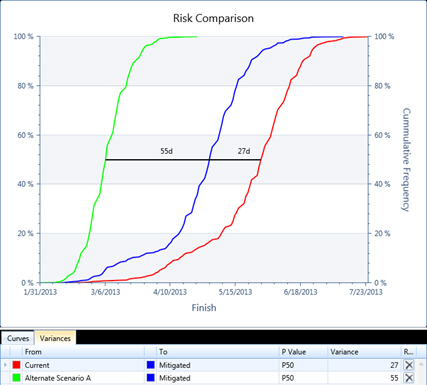 From within the Risk Exposure Comparison Chart, you can rename and annotate scenarios by clicking on a given P or Confidence level within the chart itself. Variances are shown in the table beneath the chart.