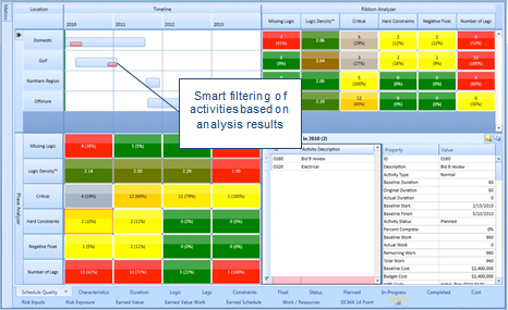 As you click on the any of analyzer cells, the activities shown within the ribbons are automatically filtered to correspond to the activities in the activity browser.