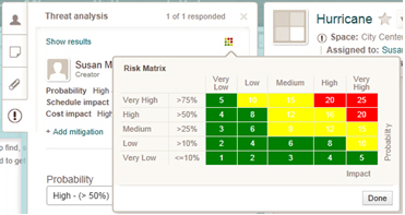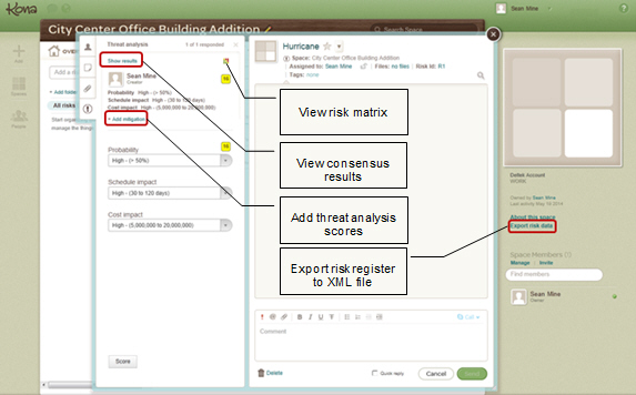 As the owner of the Kona space, you can invite people to the space to add comments and to share their opinions about the risks. For example, you may have listed a very high risk probability whereas others may feel the probability is a medium risk.