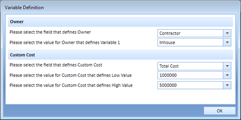 At run-time, the user is prompted for the field that is being used in the calculation as well as the two variable costs being used in the metric calculation.