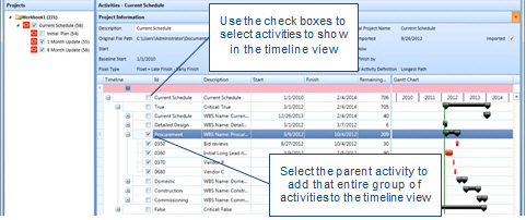 Add activities to the Timeline view. This is useful when looking at the big picture within a project as well as comparing a project to its respective snapshots or scenarios.