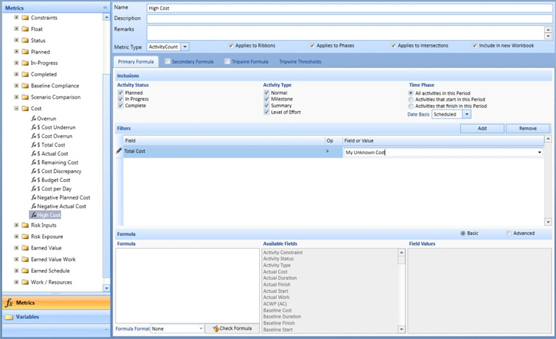 The screenshot below shows an example of a metric called High Cost being defined using the variable My Unknown Cost.