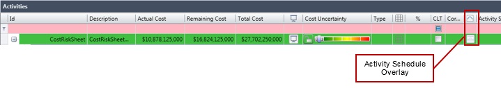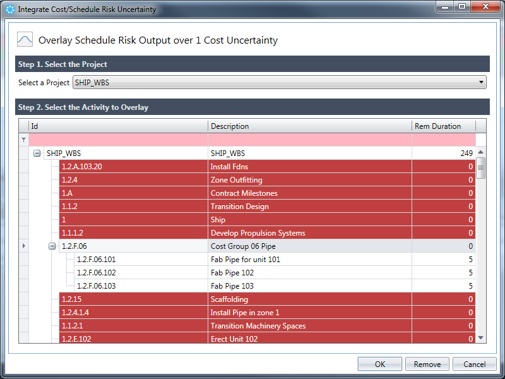 On the Integrate Cost/Schedule Risk Uncertainty dialog box, select a project and the desired activities from the schedule model to apply schedule impact to specific cost elements (or the cost estimate as a whole).