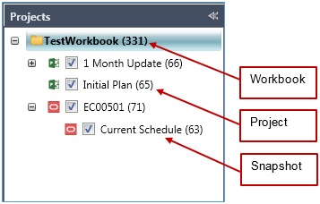 Links within a workbook to data sources can either be projects or snapshots. A project can contain one or more snapshots and a workbook can contain one or more projects.