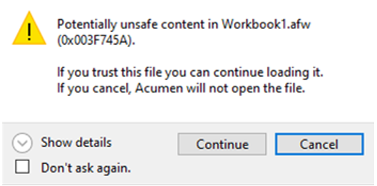 Acumen issues different warning messages when you try to open a workbook that has potentially unsafe content. There are two conditions wherein potentially unsafe content is screened: