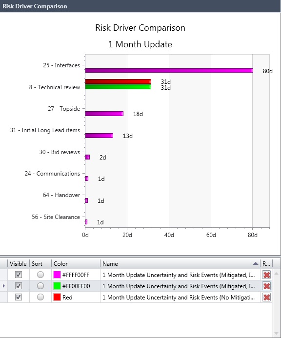 The Risk Driver Comparison chart displays several cost / schedule risk driver result sets on the same chart. Each result set is summed either by activity or by risk.