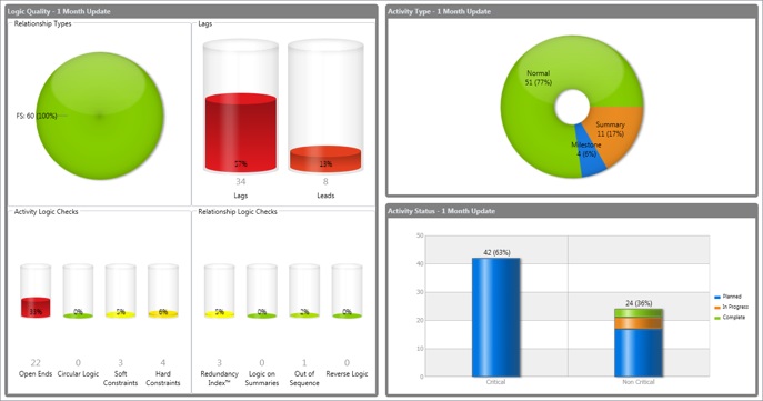 The Acumen dashboard provides an interactive overview of project(s) status; schedule quality, metrics, forensics, and changes made over time.