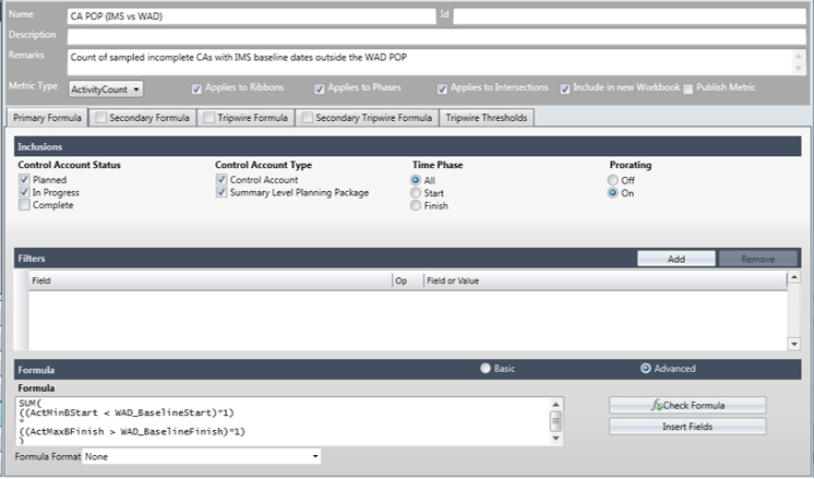 In the example below, we want to know the number of control accounts that have activities that are outside of the dates that were authorized in the WAD. The metric uses activity calculated fields to find the earliest baseline start and the latest baseline finish and compares them to the WAD baseline start and WAD baseline finish.