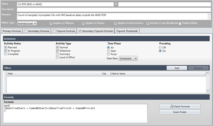 The Secondary Tripwire Formula tab is only available for control accounts and work packages. The secondary tripwire formula always looks at activities, regardless of whether you are using a control account or work package metric. Its purpose is to find the activities that are causing the work package or control account an issue.