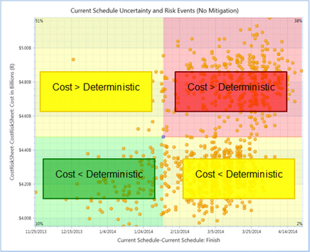 - Deterministic Quadrants provide further insight into the probability of meeting deterministic durations and/or costs. Use the Deterministic Quadrants check box to add/remove the quadrants from the chart.