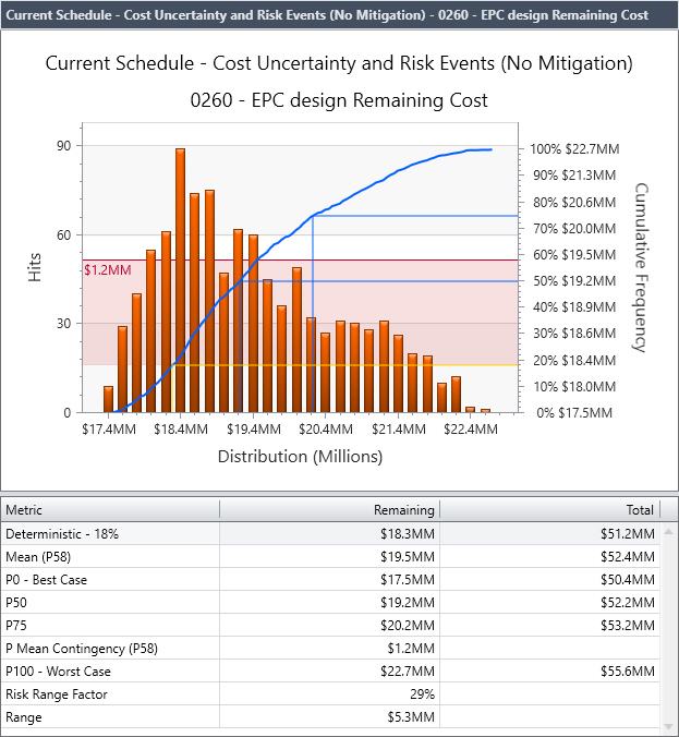 In addition, you can graphically plot contingency (the difference between a deterministic value and a P-value) by clicking in the chart in the desired location and selection one of the Add/Remove contingency options. Positive contingency is highlighted in red, negative contingency (that is, when your estimate has too much contingency built into it) is highlighted in green.