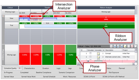 • The ribbon analyzer tells you which group of activities (Critical or Non-Critical) has missing logic.