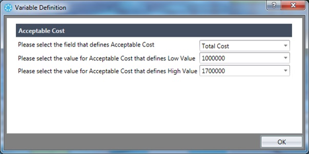 At run-time, the user is prompted for the field that is being used in the calculation as well as the two variable costs being used in the metric calculation.