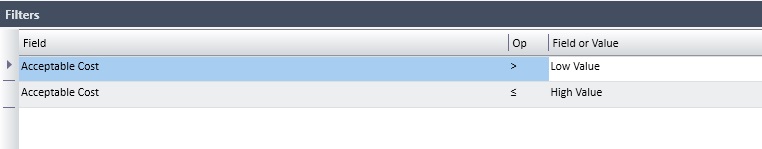 For example, you can create a variable field called Acceptable Cost that contains two variables - Low Value and High Value. You then define a metric based on two criteria: The Total Cost being greater than Low Value, and less than or equal to High Value.