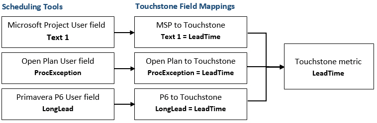 You have a user-defined field that the user has named Text1 in Microsoft Project, ProcException in Open Plan, and LongLead in Primavera. The equivalent field in the Touchstone metric is named LeadTime. You need to tell Touchstone that fields named Text1, ProcException, and LongLead must be imported into LeadTime. You accomplish this by mapping the scheduling fields to the Touchstone field.