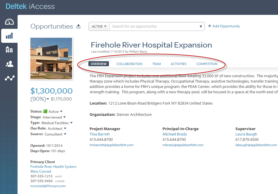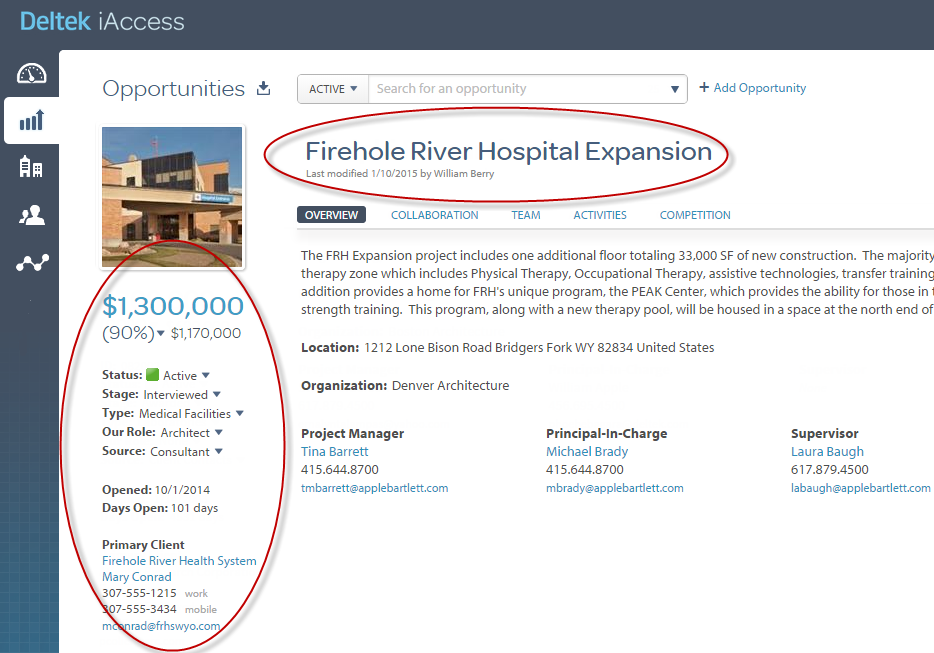 The title or name for the currently selected opportunity, company, or contact displays in the upper-left corner of the area, and key data display down the left edge to provide a summary view.