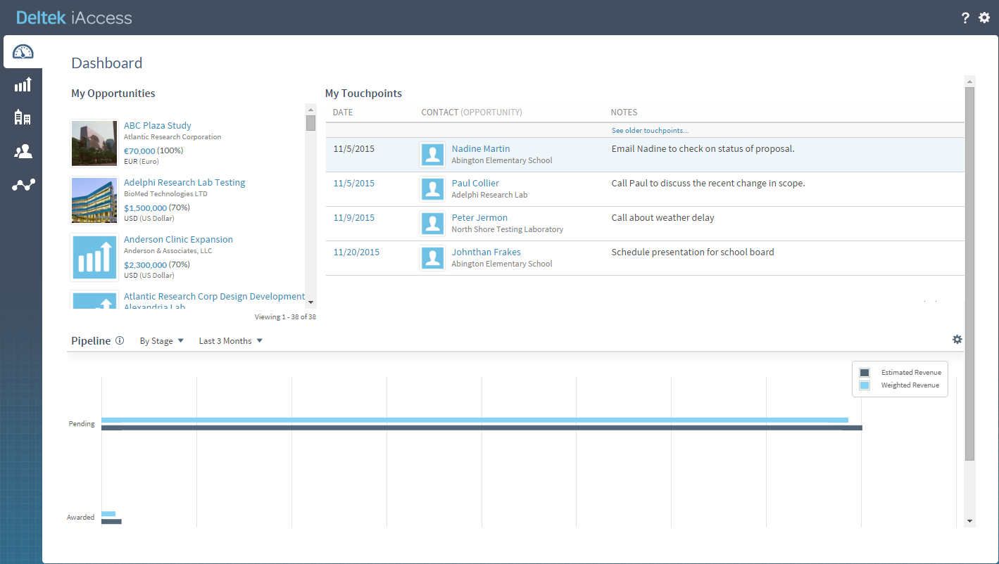 The Dashboard area of iAccess provides a list of the opportunities for which you are a team member, a list of your upcoming or historical touchpoints, and a Pipeline bar chart that displays estimated and weighted revenue for a set of opportunities that you select. You can break down the revenue on the chart based on any of a number of opportunity dimensions (for example, by client, by market, or by stage).