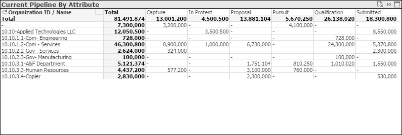 The Current Pipeline by Attribute table displays pipeline amounts for each stage as of today's date. You can further break down the pipeline by individual opportunity or by any of the following opportunity attributes: client, project manager, or organization.