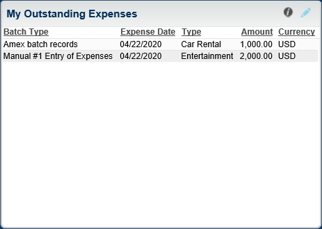 The My Outstanding Expenses dashpart is a numerical table that lists your outstanding expenses. The data on this dashpart comes from Time & Expense.