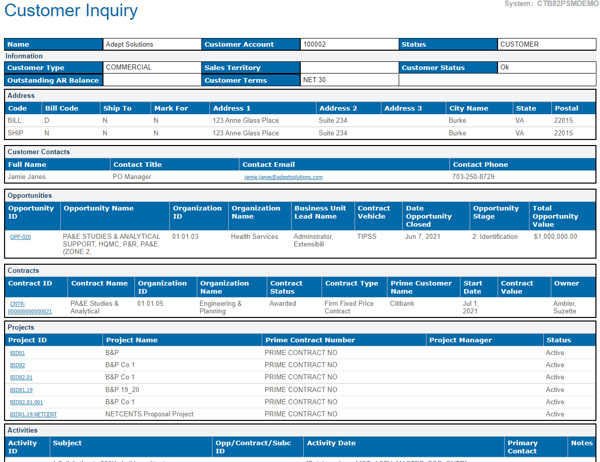 Sample Report This is a sample of the Customer Inquiry report. Parent Topic: Customer Inquiry HomeReports & AnalyticsWelcome to Costpoint Business IntelligenceOverviewCapture & ContractsCapture & Contracts ReportsCustomer InquirySample Report