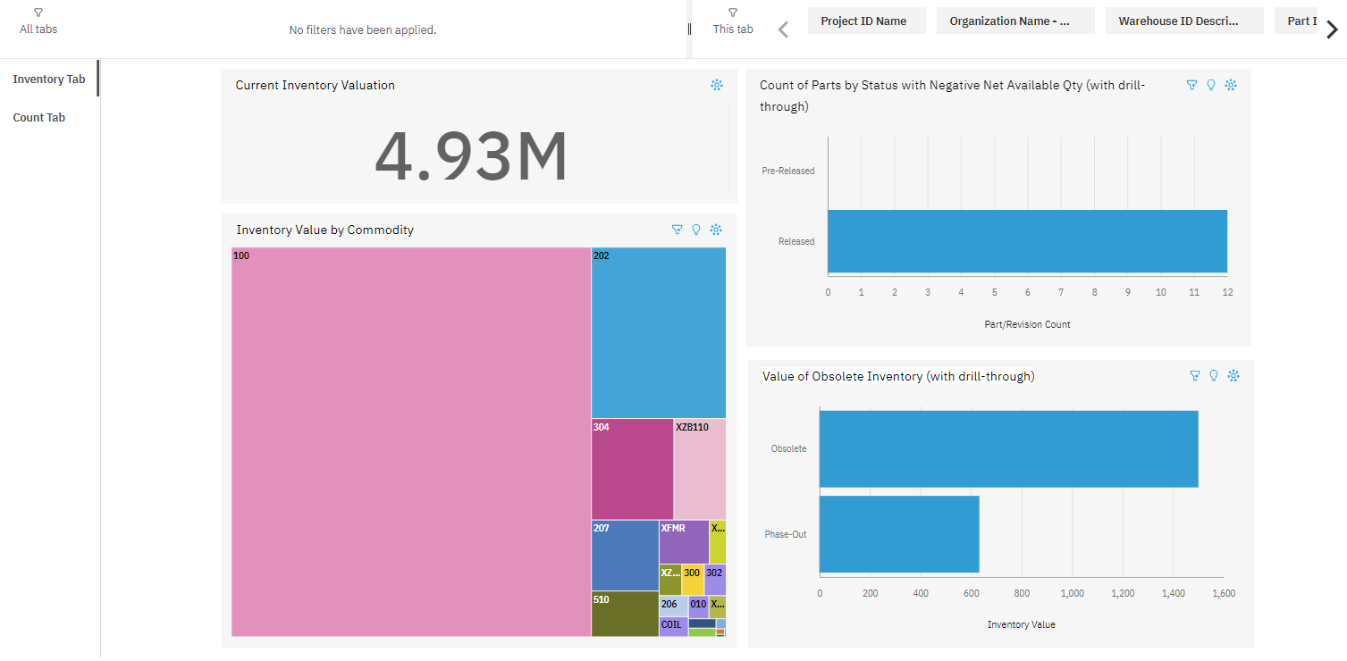 The Inventory Tab provides data to help you analyze your inventory. You can also filter the data based on project, organization, warehouse, and part.