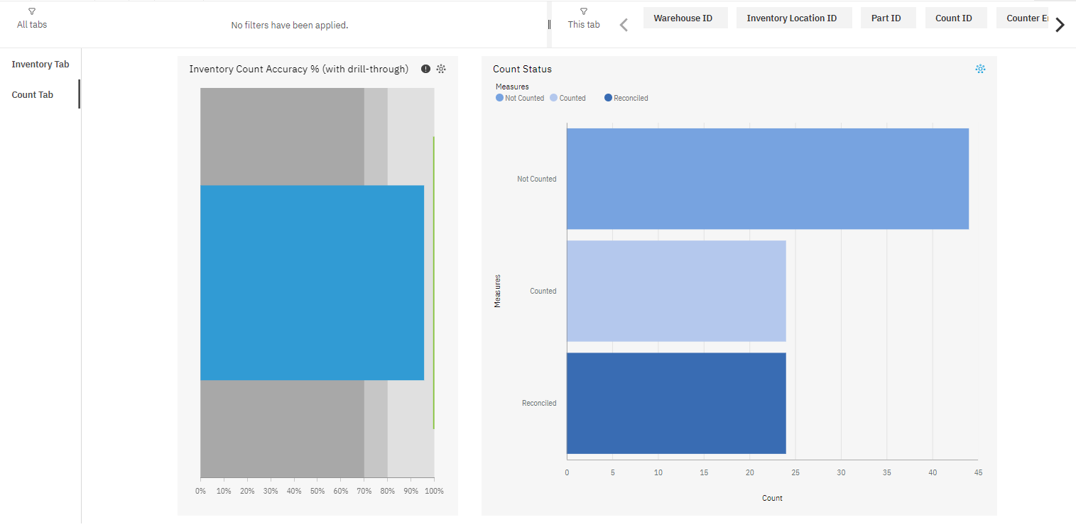 The Count Tab provides inventory count data that you can filter by location, part, count ID, warehouse, the employee who performed the count, inventory abbreviation code, and counted date.