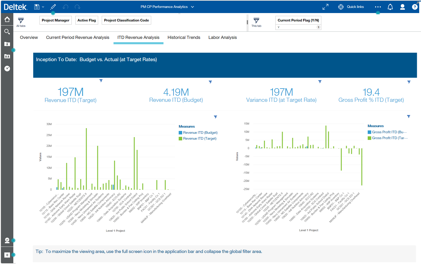 If Organization security is used in Costpoint, users will only see the projects that belong to the organizations they have access to. However, if Project Manager Security is enable they will see only projects they are assigned to as PM. The dashboard has 5 tabs covering a different view of the project data. Note that all project results use Target Rates for actual results.