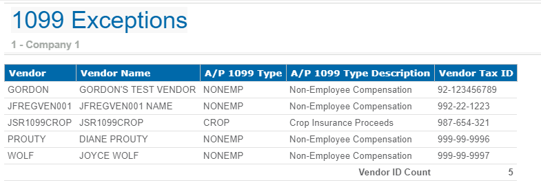 Sample Report Sample 1099 Exceptions report. Parent Topic: 1099 Exceptions Report HomeReports & AnalyticsWelcome to Costpoint Business IntelligenceOverviewAccounts Payable Accounts Payable Reports1099 Exceptions ReportSample Report