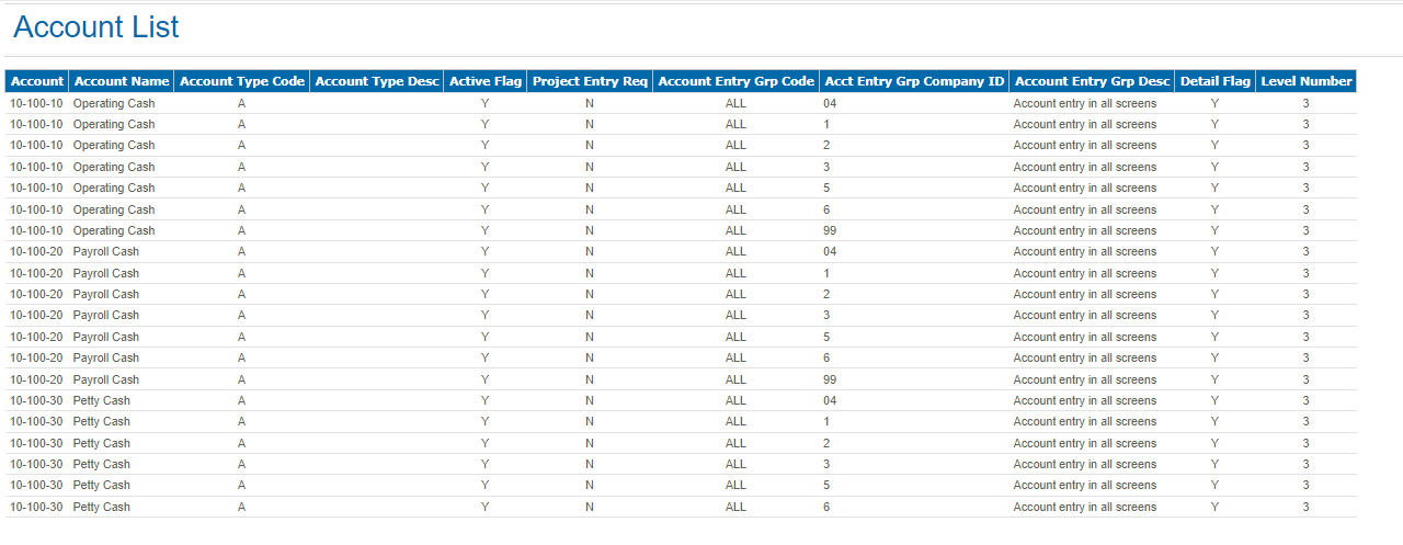 Sample Report This sample shows the Account List. Parent Topic: Account List Report HomeReports & AnalyticsWelcome to Costpoint Business IntelligenceOverviewGeneral LedgerGeneral Ledger ReportsAccount List ReportSample Report