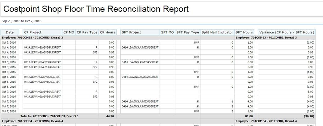 Sample Costpoint Shop Floor Time Reconciliation report.