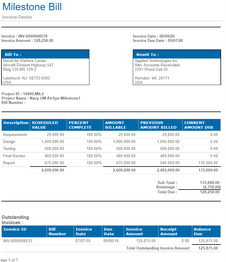 Sample Report View a sample of the Milestone Bill report. Parent Topic: Milestone Invoice Report HomeReports & AnalyticsWelcome to Costpoint Business IntelligenceOverviewBillingBilling ReportsMilestone Invoice ReportSample Report