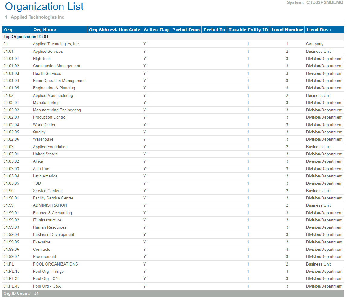 Sample Report View a sample of the Organization List report. Parent Topic: Organization List HomeReports & AnalyticsWelcome to Costpoint Business IntelligenceOverviewGeneral LedgerGeneral Ledger ReportsOrganization List Sample Report