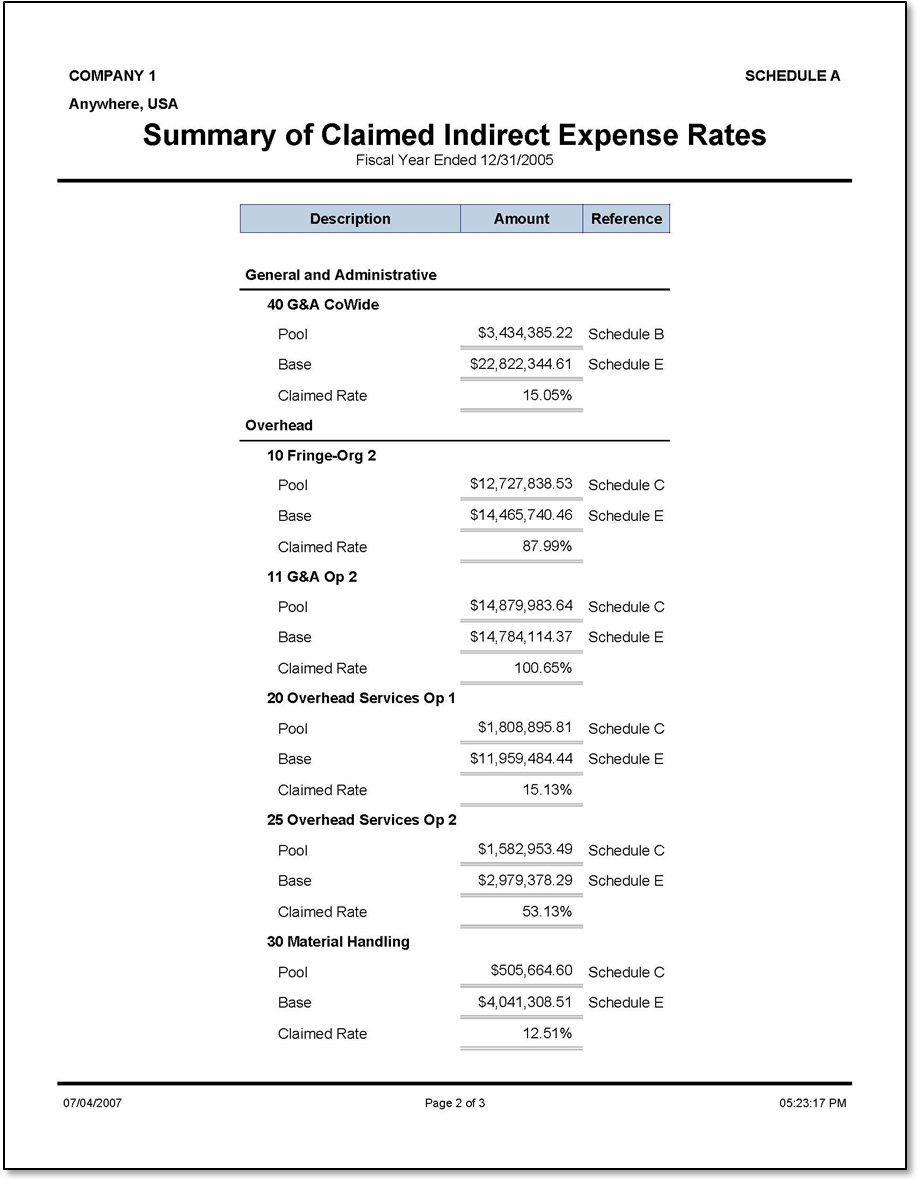 Sample Report Sample Summary of Claimed Indirect Expense Rates report. Parent Topic: Schedule A — Summary of Claimed Indirect Expense Rates HomeReports & AnalyticsWelcome to Costpoint Business IntelligenceOverviewIncurred Cost Submission ReportsSchedule A — Summary of Claimed Indirect Expense RatesSample Report