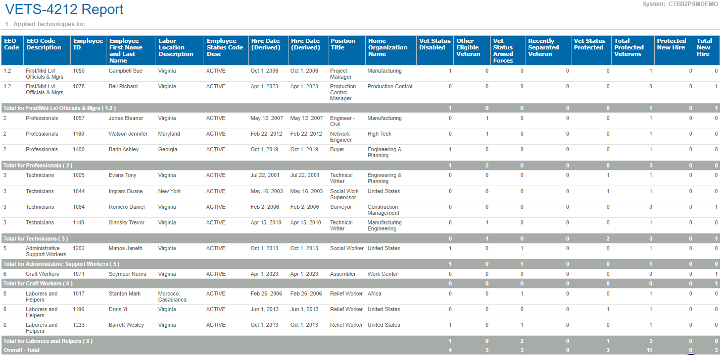 Sample Report A sample of the VETS-4212 report. Parent Topic: VETS-4212 Report HomeReports & AnalyticsWelcome to Costpoint Business IntelligenceOverviewHuman ResourcesHuman Resources ReportsVETS-4212 ReportSample Report