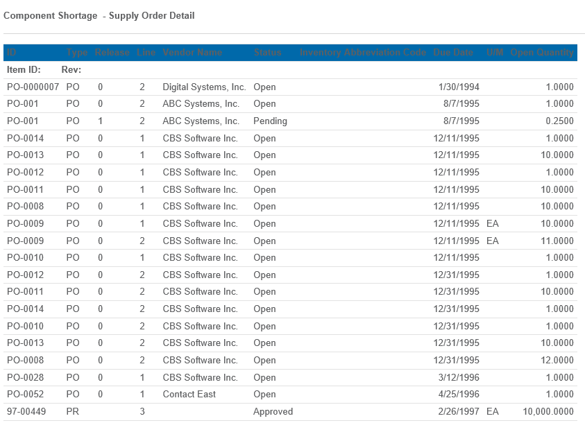 Click the MO Number to view the component shortage - supply order details.