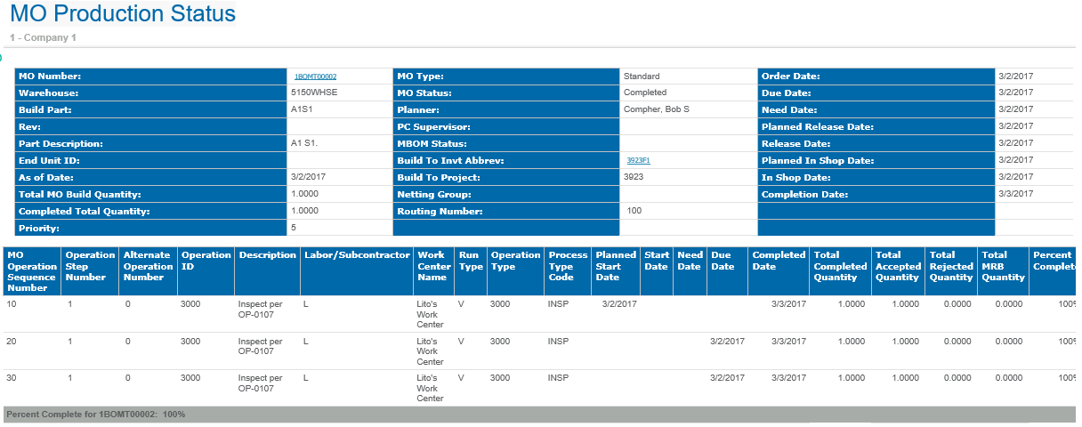 This is a sample MO Production Status report.
