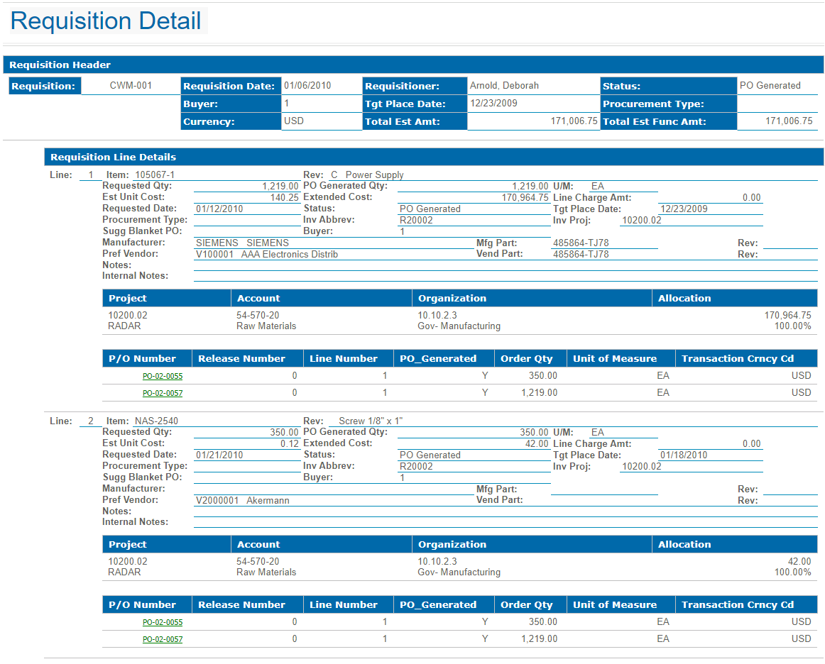 In the Requisition Detail - Drill Thru report, click a P/O Number to view purchase order details.