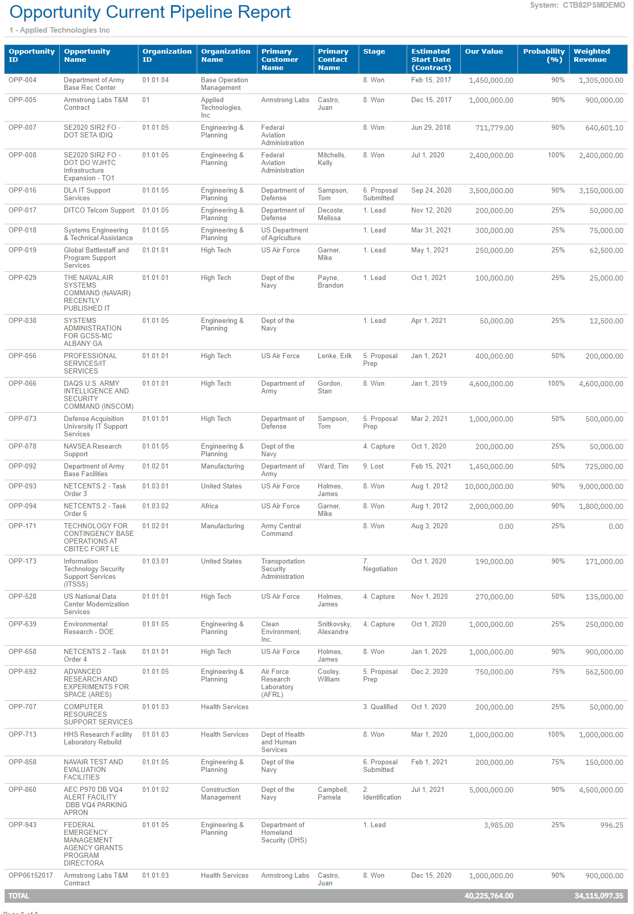The Opportunity Current Pipeline report displays all your current pipeline data that helps you assess the opportunities that you can work on and the probability to win each.