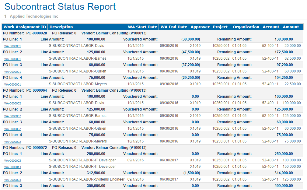 Click a Work Assignment ID to view the Subcontractor Status Report Drill Thru.