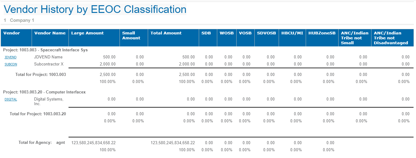 This is a sample of the Vendor History by EEOC Classification report.