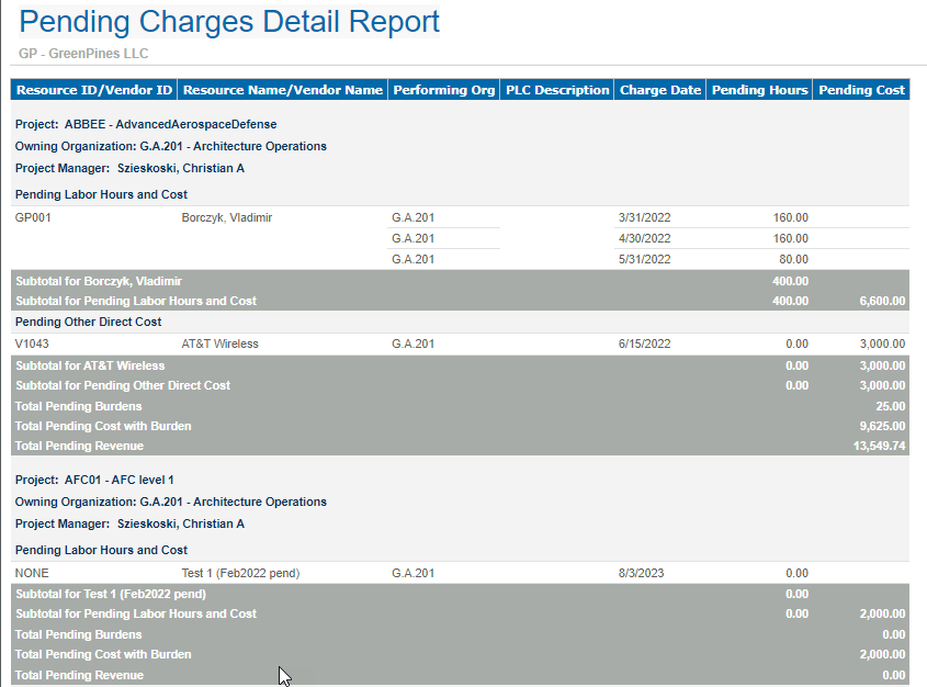 Sample Report This is an example of the Pending Charges Detail report. Parent Topic: Pending Charges Detail Report HomeReports & AnalyticsWelcome to Costpoint Business IntelligenceOverviewPlanningPlanning ReportsPending Charges Detail ReportSample Report