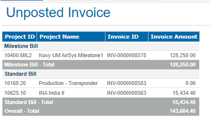 The report shows the invoice ID, project ID, project name, and invoice amount for each type of invoice.